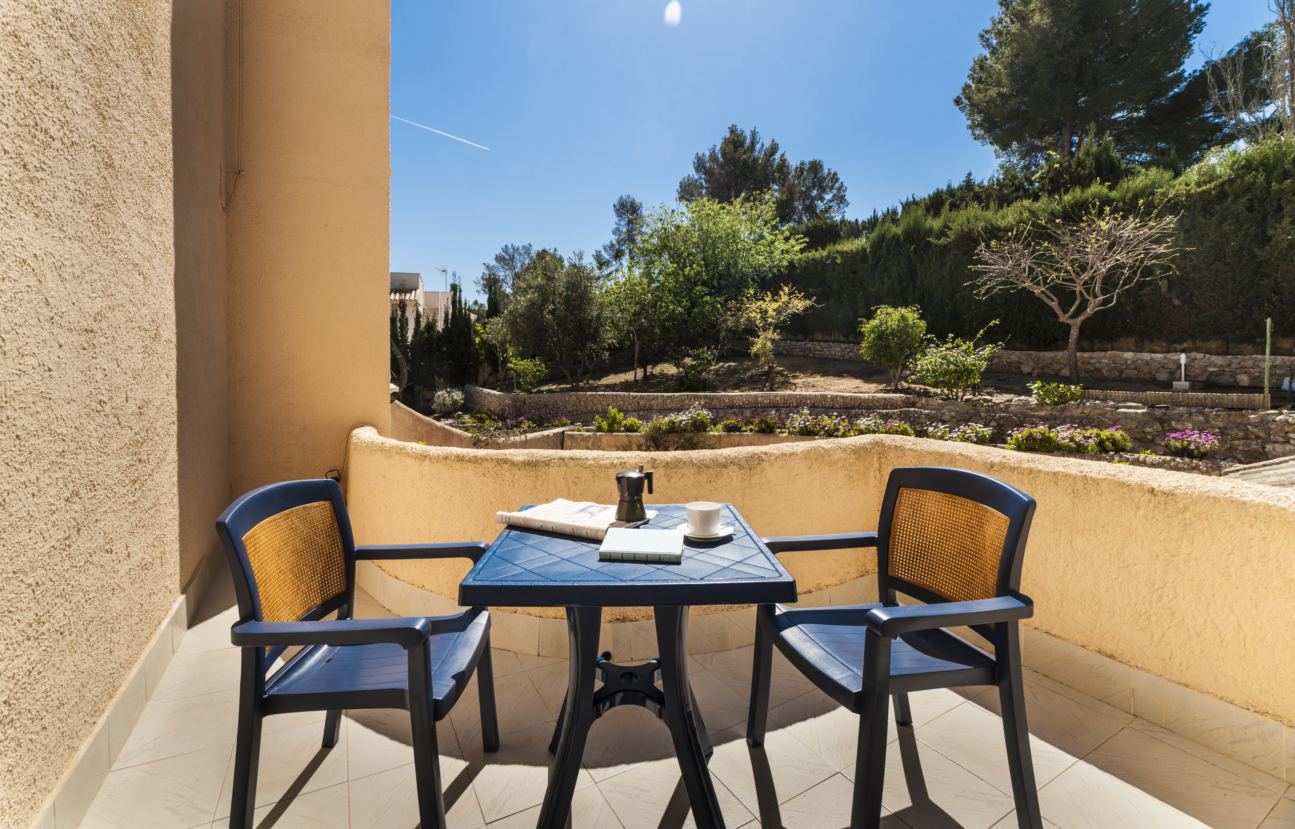 El patio interior ofrece un rincón íntimo con mesa y sillas, además de un porche perfecto para las tardes de verano. La villa también cuenta con dos terrazas superiores con vistas despejadas y un jardín privado con árboles frutales y flora autóctona que rodea la propiedad.